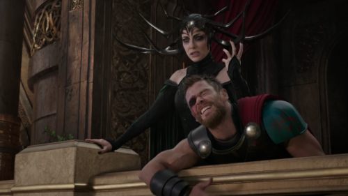 As you can tell, my man CHRIS Hemsworth (not his brother Liam like I said last time, that was my bad sorry) is not taking any "guff" from Hela (Cate Blanchett)! She tries to blow up his spot by being like "You're in my seat" but Thor is all "Nah, son" and throws his hammer at her FACE. It's pretty cool, and even though Hela says she is the Queen of Death I'm pretty sure Thor's gonna kick her ass because 1) he's the hero and B) he has mad lightning skills.